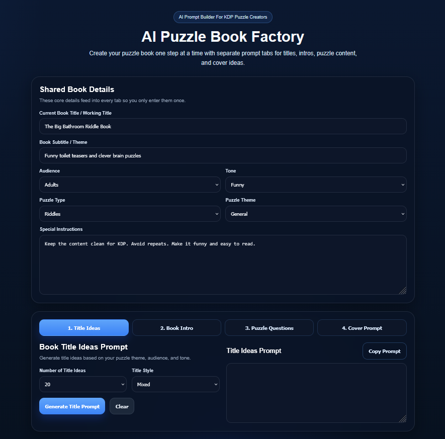 Your main tool for creating puzzle books using a simple step-by-step workflow. Move through each section to generate your title ideas prompts, introduction prompts, puzzle content prompts, and cover prompts, all structured and ready to use.
