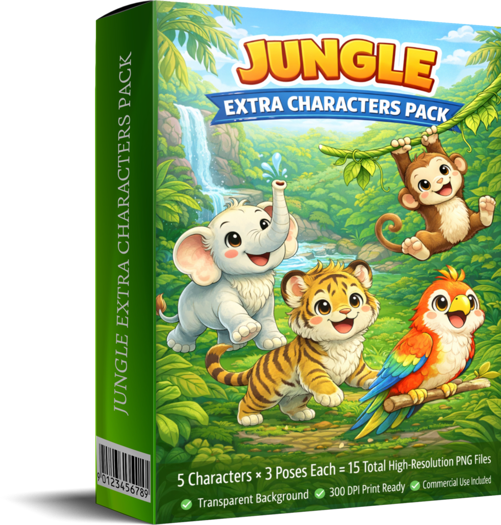 A collection of expressive jungle animal characters in multiple poses, perfect for building adventure-themed books, learning series, or coordinated story collections that feel consistent and recognisable.