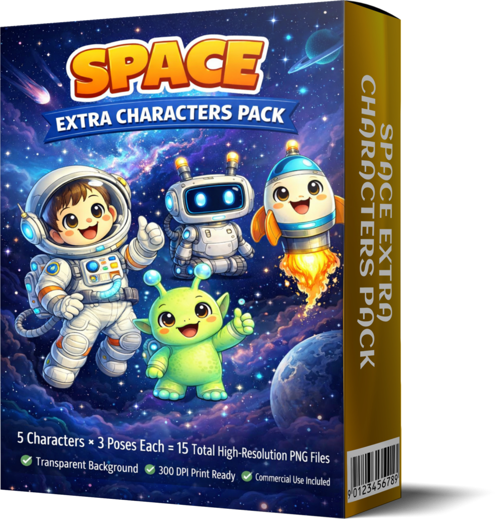 High-quality space-themed characters in multiple dynamic poses, allowing you to design adventurous, educational, or premium storybook covers that look unique and professionally branded.