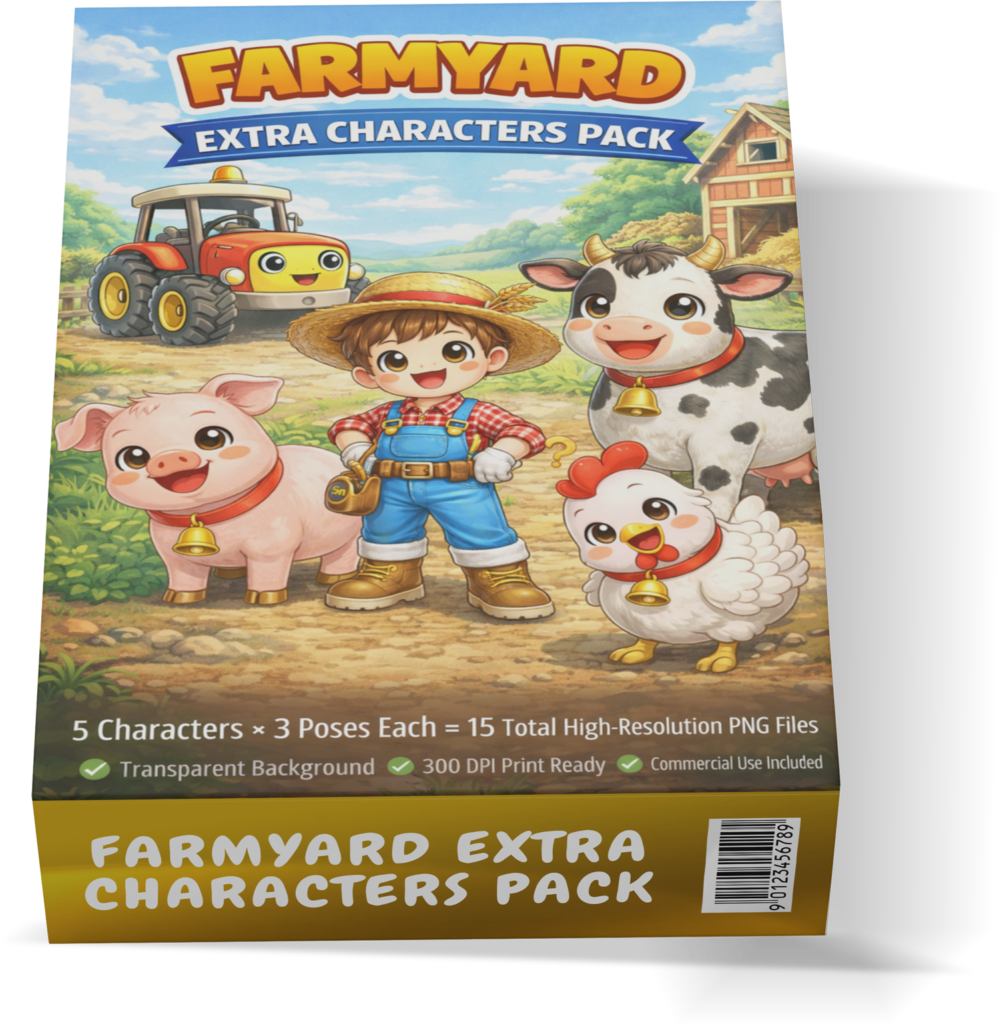 You receive 4 complete character packs plus the Farmyard bonus pack. That’s 75 transparent PNG character assets in total, including multiple pose variations for flexibility and visual variety.